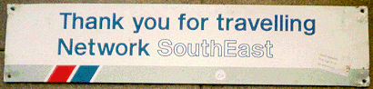 One sign no NSE station could do without was the friendly "Thank you for travelling Network SouthEast". I have one of those signs in my personal collection. It measures 6¼" x 2' 3½" and is in a very good condition apart from the slight signs of over-tight screws on the corners: